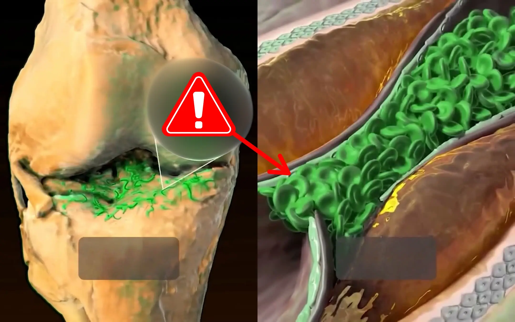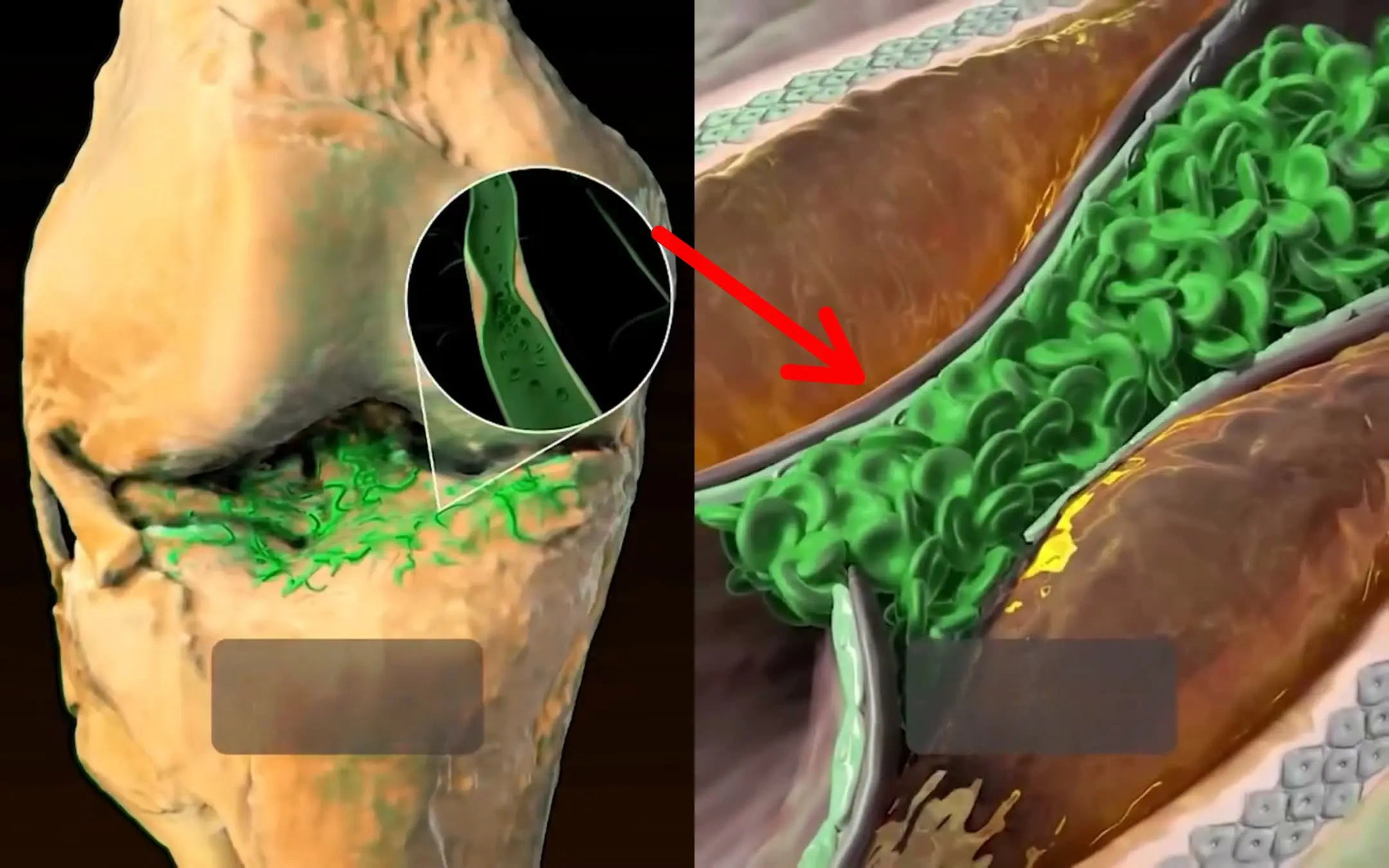 Mais avec l’âge, le fait de rester trop assise ou de consommer des aliments transformés, ce système finit par se boucher à l’endroit le plus étroit — au niveau de l’articulation du genou.